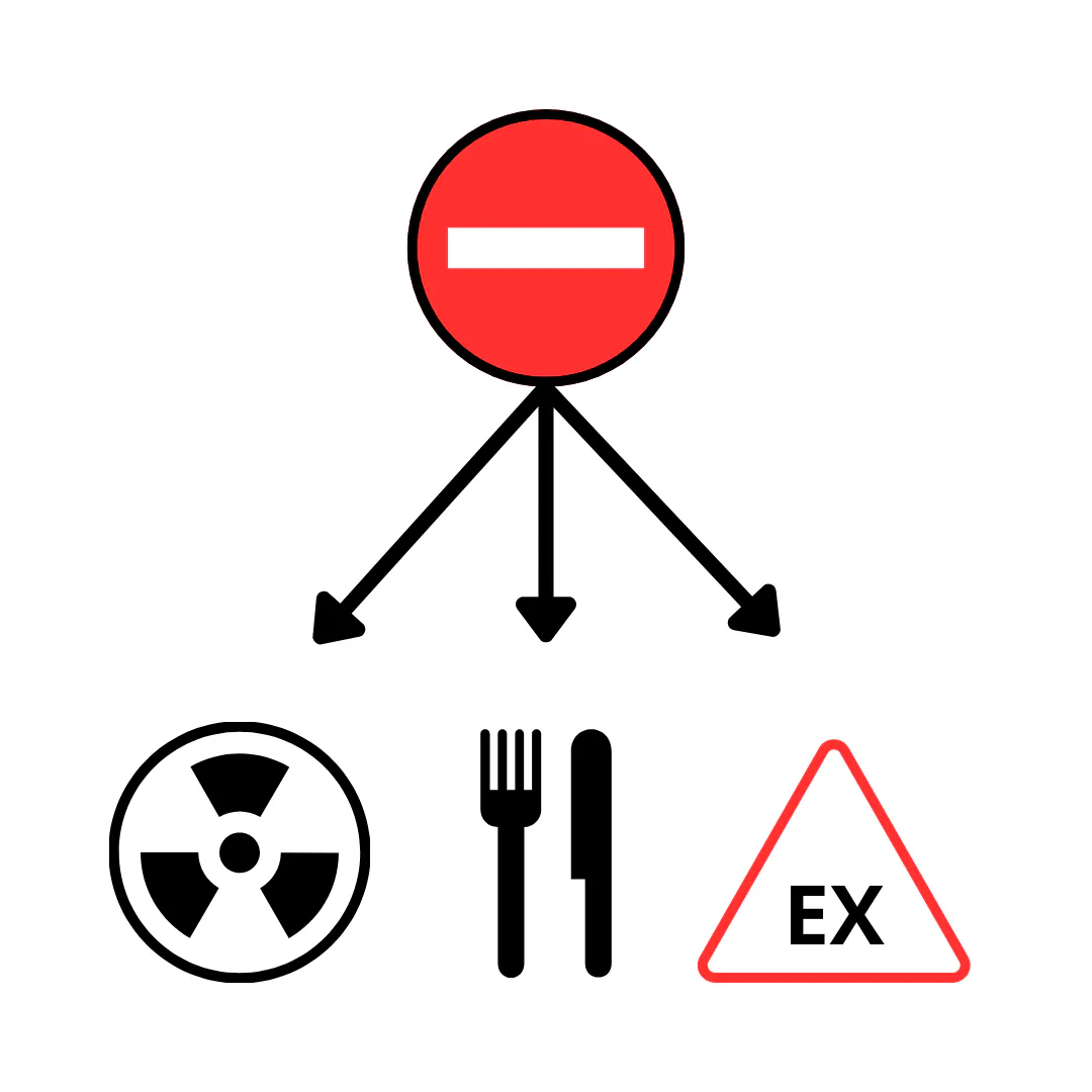 Les zones dites "ATEX" (atmosphères explosives) ne sont pas compatibles non plus avec cette caméra, les canalisations de gaz (GN, GPL, Biogaz...), d'hydrocarbures (essence, gazole, kérosène, mazout...), de solvants (acétone, méthanol, toluène...), de produits chimiques et pharmaceutiques, ou celles transportant des poussières de sucre, farine, céréales, charbon, métaux (comme l'aluminium ou le magnésium), etc.
